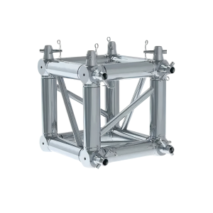 Cubo de ligação que permite unir várias barras de truss em diferentes ângulos, facilitando conexões complexas com segurança e estabilidade.